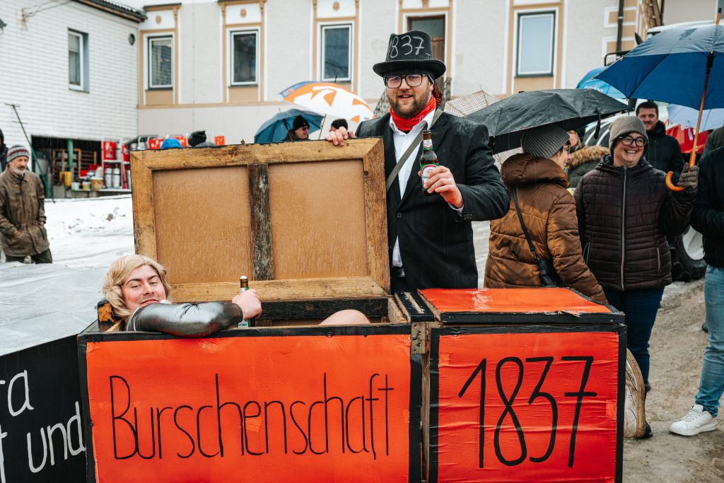 Der “Blaue Montag” und ein weiterer Bursch haben die ehrenvolle Aufgabe in drei Gasthäuser zu festgelegten Zeiten die Schandtaten einiger Eberschwanger der Bevölkerung vorzutragen. Letzter Treffpunkt aller Burschen ist schließlich das Gasthaus Panoptikum in Mühring, wo dieser Vortrag im prall gefüllten Saal für dieses Jahr zum letzten Mal erfolgt. Somit ist das anstrengende Ballwochenende offiziell beendet.